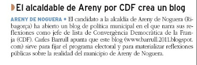 El candidato a la alcaldía de Areny de Noguera (Ribagorça) ha abierto un blog de política municipal en el que narra sus reflexiones como jefe de lista de Convergència Democràtica de la Franja (CDF). Carles Barrull apunta que este blog (www.barrull.2011.blogspot. com) sirve para fijar el programa electoral y para materializar reflexiones públicas sobre la realidad del municipio de Areny de Noguera.