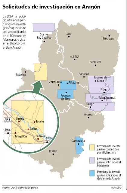 Por su parte, el Ministerio de Industria ha recibido seis solicitudes para buscar yacimientos propicios para el uso de la fractura hidráulica que afectan a Aragón: cuatro en la frontera con Cataluña y dos en el límite con Navarra. Todas ellas han sido presentadas por la misma empresa, y es muy probable que, tras la autorización del pasado viernes, el Consejo de Ministros le apruebe otras.