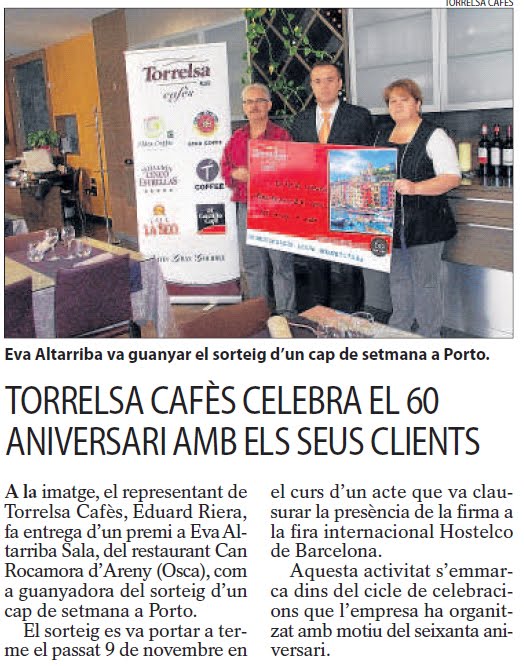 el representant de Torrelsa Cafès, Eduard Riera, fa entrega d’un premi a Montse Altarriba Sala, del restaurant Can Rocamora d’Areny (Osca), com a guanyadora del sorteig d’un cap de setmana a Porto. El sorteig es va portar a terme el passat 9 de novembre en el curs d’un acte que va clausurar la presència de la firma a la fira internacional Hostelco de Barcelona. Aquesta activitat s’emmarca dins del cicle de celebracions que l’empresa ha organitzat amb motiu del seixanta aniversari.
