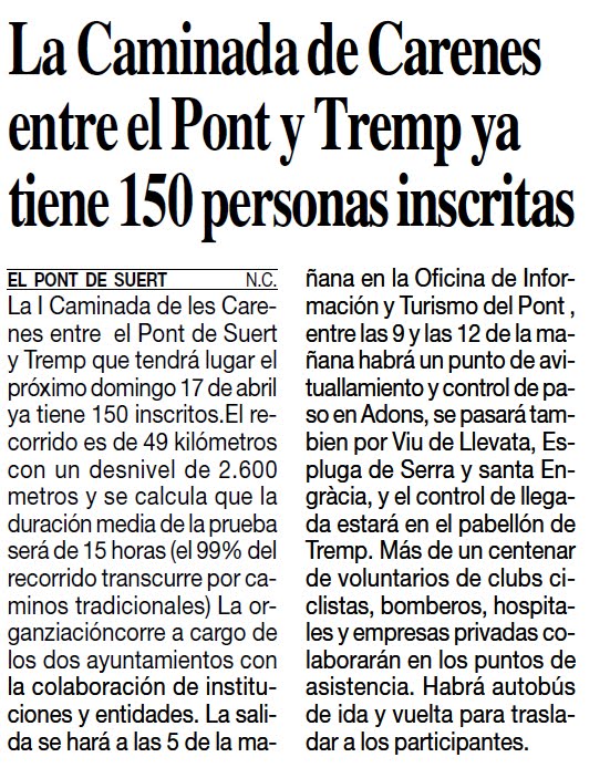 La I Caminada de les Carenes entre el Pont de Suert y Tremp que tendrá lugar el próximo domingo 17 de abril ya tiene 150 inscritos. El recorrido es de 49 kilómetros con un desnivel de 2.600 metros y se calcula que la duración media de la prueba será de 15 horas (el 99% del recorrido transcurre por caminos tradicionales) La organziación corre a cargo de los dos ayuntamientos con la colaboración de instituciones y entidades. La salida se hará a las 5 de la mañana en la Oficina de Información y Turismo del Pont , entre las 9 y las 12 de la mañana habrá un punto de avituallamiento y control de paso en Adons, se pasará tambien por Viu de Llevata, Espluga de Serra y santa Engràcia, y el control de llegada estará en el pabellón de Tremp. Más de un centenar de voluntarios de clubs ciclistas, bomberos, hospitales y empresas privadas colaborarán en los puntos de asistencia. Habrá autobús de ida y vuelta para trasladar