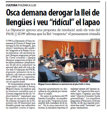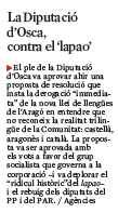 El ple de la Diputació d’Osca va aprovar ahir una proposta de resolució que insta la derogació “immediata” de la nova llei de llengües de l’Aragó en entendre que no reconeix la realitat trilingüe de la Comunitat: castellà, aragonès i català. La proposta va ser aprovada amb els vots a favor del grup socialista que governa a la corporació –i va deplorar el “ridícul històric”del lapao– i el rebuig dels diputats del PP i del PAR. / Agències