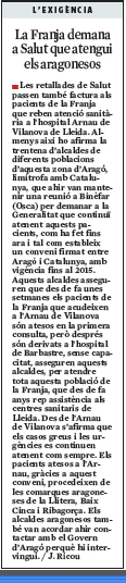 Les retallades de Salut passen també factura als pacients de la Franja que reben atenció sanitària a l’hospital Arnau de Vilanova de Lleida. Almenys així ho afirma la trentena d’alcaldes de diferents poblacions d’aquesta zona d’Aragó, limítrofa amb Catalunya, que ahir van mantenir una reunió a Binèfar (Osca) per demanar a la Generalitat que continuï atenent aquests pacients, com ha fet fins ara i tal com estableix un conveni firmat entre Aragó i Catalunya, amb vigència fins al 2015. Aquests alcaldes asseguren que des de fa unes setmanes els pacients de la Franja que acudeixen a l’Arnau de Vilanova són atesos en la primera consulta, però després són derivats a l’hospital de Barbastre, sense capacitat, asseguren aquests alcaldes, per atendre tota aquesta població de la Franja, que des de fa anys rep assistència als centres sanitaris de Lleida. Des de l’Arnau de Vilanova s’afirma que els casos greus i les urgències es continuen atenent com sempre. Els pacients atesos a l’Arnau, gràcies a aquest conveni, procedeixen de les comarques aragoneses de la Llitera, Baix Cinca i Ribagorça. Els alcaldes aragonesos també van acordar ahir contactar amb el Govern d’Aragó perquè hi intervingui.