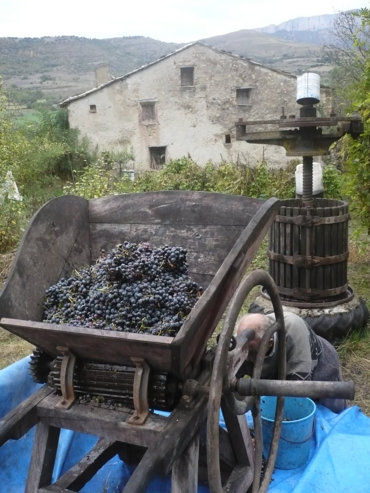 picar i premsar al mateix moment i fer vi “clarete”, un vi que només s’aguanta una campanya i que dins d’un porró ha acompanyat els menjars familiars durant els últims anys.