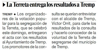 Los organizadores de la votación popular para la segregación de la Terreta, que se celebró este domingo, entregaron el acta con los resultados al Ayuntamiento de Tremp. Los promotores de la consulta se querían entrevistar con el alcalde de Tremp, Víctor Orrit, para darle los resultados de la consulta y hacerlo conocedor de la voluntad de la Terreta de segregarse del municipio de Tremp.