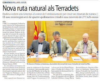 La companyia Endesa ha cedit l’entorn de l’embassament de Terradets al consell comarcal del Pallars Jussà i a l’ajuntament de Castell de Mur per fer un itinerari de natura. Endesa va firmar ahir el conveni de cessió de l’espai durant 15 anys amb les administracions del territori. El nou recorregut tindrà uns quatre quilòmetres i suposarà una inversió de 277.626 euros. Aquest itinerari té com a objectiu compatibilitzar la preservació del patrimoni natural de la comarca i fer-ne una atracció turística respectuosa. El nou sender va ser batejat amb el nom de Pont de Monares-Cellers-Mirador de lesAus, serà tant per a vianants com per a ciclistes i passarà per Espais d’Interès Natural inclosos a la Xarxa Natura 2000. La iniciativa correspon a la tercera actuació d’un projecte que pretén crear una xarxa de recorreguts naturals entorn del riu Noguera Pallaresa i en el marc del territori CollegatsTerradets. Així, aquest nou itinerari suposa la continuació d’un traçat ja existent i farà possible passejar des delMirador de les Aus de la Pineda de Cellers fins al Pont de Monares. La ruta estarà al marge dret de l’embassament, entre l’aigua i la carretera C-13 i al seu pas hi ha l’hotel Terradets, el poble de Cellers i l’alberg estació de ferrocarril de Cellers-Llimiana. Per part de la companyia elèctrica, els signants van ser María Soledad Ordóñez i JosepMaria RoviraVilanova, director d’Endesa a Catalunya. També van firmar l’alcalde de Castell de Mur, Josep Castells Farré, i el president del consell comarcal del Pallars Jussà, Joan Ubach iIsanta.