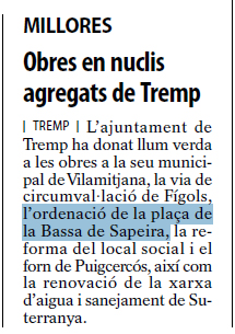 L’ajuntament de Tremp ha donat llum verda a les obres a la seu municipal deVilamitjana, la via de circumval·lació de Fígols, l’ordenació de la plaça de la Bassa de Sapeira, la reforma del local social i el forn de Puigcercós, així com la renovació de la xarxa d’aigua i sanejament de Suterranya.